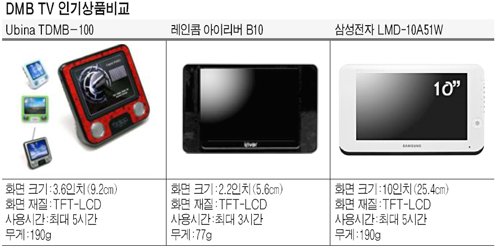 ÇÏÁö¸¸ ÀÌµé ±â±â´Â »ó´ëÀûÀ¸·Î °í°¡¿©¼­ DMB¸¸À» À§ÇØ ±¸ÀÔÇϱâ´Â ½±Áö ¾Ê´Ù. ÀÌ·± ºÒ¸¸À» ÇØ¼Ò½Ã۱â À§ÇØ DMB ¹æ¼ÛÀ» ½ÃûÇϱâ À§ÇÑ Àü¿ë ±â±âµéÀÌ Ãâ½ÃµÆ´Ù. Æ÷ÄÏTV¶ó ºÒ·ÁÁö°í ÀÖ´Â ÈÞ´ë¿ë DMB TV°¡ ¹Ù·Î ±×°Í. Àü¿ë±â±âÀ̱⠶§¹®¿¡ ¶Ù¾î³­ DMB ¹æ¼Û ¼ö½ÅÀ²À» ÀÚ¶ûÇϸç, µ¿½Ã¿¡ Àú·ÅÇÑ °¡°ÝÀÌ ÀåÁ¡ÀÌ´Ù.