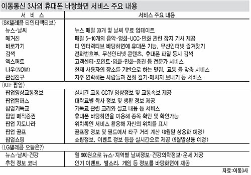 º°µµÀÇ Å° Á¶ÀÛ ¾øÀÌ ¹ÙÅÁÈ­¸é¿¡¼­ ÄÜÅÙÃ÷¸¦ Á¦°øÇÑ´Ù´Â ¼­ºñ½º ÄÁ¼ÁÆ®´Â 3°³ ȸ»ç°¡ µ¿ÀÏÇÏ´Ù. ¹ÙÅÁÈ­¸é¿¡ ´º½º, ³¯¾¾°¡ ³ª¿À´Â º°µµÀÇ ÀÛÀº âÀ» ¶ç¿ö ¿©±â¿¡ ½Ç½Ã°£À¸·Î Á¤º¸¸¦ º¸³»ÁÖ´Â Çü½Äµµ °°´Ù.