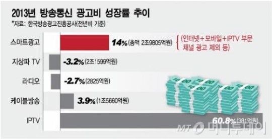 SBS¿Í MBC´Â ¾ÕÀ¸·Î KBS¿Í EBS, CJ E&M µî ÄÜÅÙÃ÷¸¦ Á¦°øÇÏ´Â ¾÷üµéÀ» Ãß°¡ ¿µÀÔÇϰڴٴ °èȹÀÌ´Ù. ÀÌó·³ ½º¸¶Æ® ¹Ìµð¾î ±¤°í½ÃÀå¿¡ Àû±Ø ³ª¼­´Â ÀÌÀ¯´Â ½ÃÀåÀÌ Á¡Â÷ Ä¿Áö°í Àֱ⠶§¹®ÀÌ´Ù. ÄÚ¹ÙÄÚ¿¡ µû¸£¸é Áö³­ÇØ ½º¸¶Æ®Æù, ½º¸¶Æ®TV, ÀÎÅͳÝ, IPTV µîÀ» ÅëÇÑ ½º¸¶Æ® ±¤°í ½ÃÀå ±Ô¸ð´Â 2Á¶9805¾ï¿ø¿¡ À̸¥´Ù. Àü³â º¸´Ù 14% ´Ã¾î °¡Àå ³ôÀº ¼ºÀå·üÀ» ±â·ÏÇß´Ù. °°Àº ±â°£ Áö»óÆÄTV ±¤°í(2Á¶1599¾ï¿ø)±Ô¸ð¸¦ ¶Ù¾î³Ñ¾ú´Ù. ¸ð¹ÙÀÏÀº 1³â µ¿¾È 122.1% ¼ºÀå¼¼·Ñ º¸¿´´Ù.