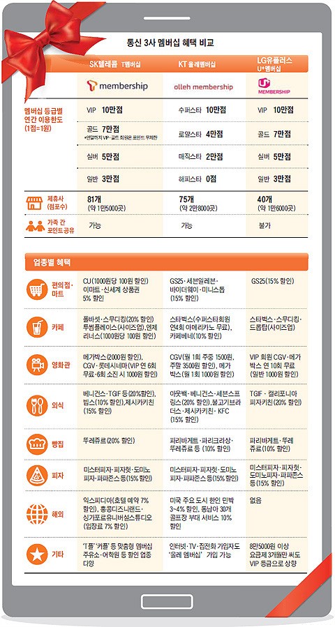 ¼Òºñ ½À°ü µî¿¡ µû¶ó KT¿Í LGÀ¯Ç÷¯½ºÀÇ ¸â¹ö½ÊÀÌ À¯¸®ÇÑ Á¡µµ ÀÖ´Ù. ¾÷Á¾º°·Î »ìÆìº¸¸é KT´Â ÆíÀÇÁ¡°ú ³îÀ̵¿»ê µî¿¡¼­ÀÇ ÇýÅÃÀÌ ´Ù¸¥ µÎ ¾÷ü¿¡ ºñÇØ Å©´Ù. SKÅÚ·¹ÄÞ°ú LGÀ¯Ç÷¯½º ¸â¹ö½ÊÀÌ °¢°¢ CU¿Í GS25¿¡¼­¸¸ ÇÒÀÎÀ» ¹ÞÀ» ¼ö ÀÖ´Â µ¥ ¹ÝÇØ KT´Â GS25 ¡¤¼¼ºìÀÏ·¹ºì¡¤¹ÙÀÌ´õ¿þÀÌ¡¤¹Ì´Ï½ºÅé µî 4°÷¿¡¼­ 15% ÇÒÀÎÀ» ¹ÞÀ» ¼ö ÀÖ´Ù. ±¹³» ÃÖ´ë Å׸¶ÆÄÅ©ÀÎ ¿¡¹ö·£µå ÀÔÀå·á¸¦ ÇÒÀÎ(40%)ÇØÁÖ´Â °÷Àº Åë½Å 3»ç Áß KT»ÓÀÌ´Ù. Æò¼Ò ÆíÀÇÁ¡À̳ª ³îÀ̵¿»êÀ» ÀÚÁÖ °¡´Â »ç¶÷Àº SKÅÚ·¹ÄÞº¸´Ù KT ¸â¹ö½ÊÀ» ¾²´Â °Ô µ·À» ´õ ¾Æ³¥ ¼ö ÀÖ´Ù. KT´Â Á¦ÈÞ Á¡Æ÷ ¼ö(2¸¸8000°÷)µµ 3»ç Áß °¡Àå ¸¹´Ù.