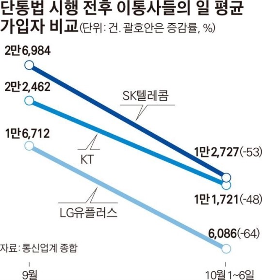 ÇÏÁö¸¸ ´ÜÅë¹ý ½ÃÇà ÈÄ ½ÃÀå »óȲÀÌ º¯Çß´Ù. Åë½Å¾÷°è¿¡ µû¸£¸é ´ÜÅë¹ý ½ÃÇà ÀÌÈÄÀÎ 1~14ÀÏ¿¡ ¹øÈ£ À̵¿ µî ½Å±Ô °¡ÀÔÀº ÀÏ Æò±Õ 5,924°ÇÀ¸·Î Áö³­ÇØ °°Àº ±â°£ ÀÏ Æò±Õ 2¸¸4,704°Ç ´ëºñ 23% ¼öÁØÀ¸·Î ±Þ°¨Çß´Ù.
