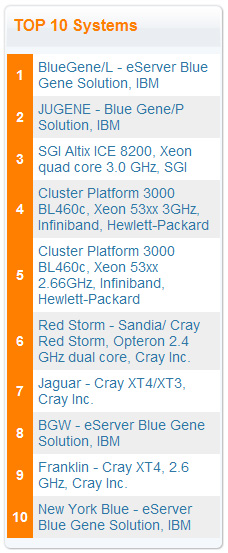 2À§´Â µ¶ÀÏ Àª¸®È÷(Forschungszentrum Juelich, FZJ)¿¡ ¼³Ä¡µÇ¾î ÀÖ´Â ºí·çÁø/P(BlueGene/P) ½ÅÁ¦Ç°ÀÌ´Ù. 167.3 Å×¶óÇ÷ӽº¸¦ ±â·ÏÇß´Ù. 3À§´Â ´º¸ß½ÃÄÚ ÄÄÇ»ÆÃ ¼¾ÅÍ(New Mexico Computing Applications Center, NMCAC)¿¡¼­ ¼³Ä¡µÈ SGI ½ÅÇü ½´ÆÛÄÄÇ»ÅÍ´Ù. ¾Ëƽ½º(Altix ICE 8200) ¸ðµ¨ÀÎ ÀÌ Á¦Ç°ÀÇ ¼º´ÉÀº 126.9 Å×¶óÇ÷ӽº¿¡ ´ÞÇß´Ù.