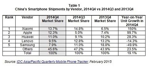 À̰°Àº Á¡À¯À²Àº Àü³â °°Àº ±â°£ ´ëºñ 49.9%Æ÷ÀÎÆ®³ª ¶³¾îÁø ¼öÄ¡·Î IDC´Â »ï¼ºÀüÀÚ°¡ Áß±¹ ÇöÁö Á¦Á¶»çµéÀÇ °Å¼¾ µµÀü¿¡ Á÷¸éÇß´Ù°í ºÐ¼®Çß´Ù. 2013³â 4ºÐ±â »ï¼ºÀüÀÚ´Â 18.8%ÀÇ Á¡À¯À²·Î ·¹³ë¹ö(13.2%)¿Í È­¿þÀÌ(10.2), ¾ÖÇÃ(7.4%), »þ¿À¹Ì(6.5%) µîÀ» ´©¸£°í Á¡À¯À² 1À§¸¦ Â÷ÁöÇÑ ¹Ù ÀÖ´Ù.