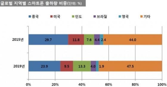 ¿ÃÇØ ±Û·Î¹ú ½º¸¶Æ®Æù ½ÃÀå¿¡¼ ±¹°¡º° ºñÁßÀº Áß±¹ÀÌ 29.7%·Î °¡Àå Å©°í, ¹Ì±¹(11.8%), Àεµ(7.6%)¼øÀÌÁö¸¸, 4³â µÚÀÎ 2019³â¿¡´Â Áß±¹°ú ¹Ì±¹ ºñÁßÀÌ °¢°¢ 23.9%, 9.5%·Î ÁÙ°í Àεµ ½ÃÀåÀÇ ºñÁßÀÌ 13.3%·Î È®´ëµÉ °ÍÀ¸·Î ¿¹»óµÆ´Ù. Àεµ°¡ ¹Ì±¹À» Á¦Ä¡°í Áß±¹ ´ÙÀ½ Å« ½º¸¶Æ®Æù ½ÃÀåÀ¸·Î ºÎ»óÇÑ´Ù´Â ¾ê±â´Ù.