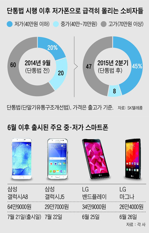 SKÅÚ·¹ÄÞ¿¡ µû¸£¸é ÀÛ³â 9¿ù ÈÞ´ëÀüÈ­¸¦ »ê »ç¶÷ Áß Ãâ°í°¡ 70¸¸¿ø ÀÌ»óÀÇ °í°¡ Á¦Ç°À» »ê »ç¶÷ÀÌ 60%¿´´Ù. 40¸¸¿ø ÀÌÇÏÀÇ Àú°¡ÆùÀ» »ê »ç¶÷Àº ºÒ°ú 20%¿´´Ù. °°Àº Á¶»ç¿¡¼­ ¿Ã 2ºÐ±â¿¡´Â °í°¡Æù ±¸¸ÅÀÚ°¡ 47%·Î ÁÙ¾îµç ¹Ý¸é Àú°¡Æù ±¸¸ÅÀÚ´Â 45%·Î ±ÞÁõÇß´Ù. ¼ÒºñÀÚµéÀÇ ±¸¸Å ÆÐÅÏÀÌ ±ØÀûÀ¸·Î ´Þ¶óÁø °ÍÀÌ´Ù. ¹Ù·Î ÀÛ³â 10¿ù ½ÃÇàµÈ ´Ü¸»±âÀ¯Å뱸Á¶°³¼±¹ý ¶§¹®ÀÌ´Ù. ÈÞ´ëÀüÈ­¸¦ »ì ¶§ Áö¿ø¹Þ´Â º¸Á¶±ÝÀÇ »óÇѼ±ÀÌ Á¤ÇØÁö¸é¼­ ½º¸¶Æ®Æù ¼ö¿ä°¡ Àú°¡ Á¦Ç° ÂÊÀ¸·Î ±Þ°ÝÈ÷ ½ò¸° °ÍÀÌ´Ù.