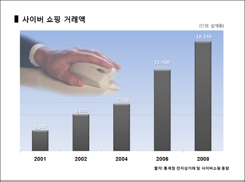 ƯÈ÷ »çÀ̹ö¼îÇÎ °Å·¡¾×Àº 18Á¶1460¾ï ¿øÀ¸·Î Àü³â 15Á¶7660¾ï ¿ø¿¡ ºñÇØ 15.1% Áõ°¡Çß´Ù. ¶Ç Áö³­ÇØ ¸» ³óÇù°æÁ¦¿¬±¸¼Ò¿¡¼­ ¹ßÇ¥ÇÑ ¡®2009 ±¹³»¼Ò¸Å½ÃÀå Àü¸Á¡¯¿¡¼­´Â ¿ÃÇØ »çÀ̹ö¼îÇÎ ºÎ¹® ¿¹»ó ¸ÅÃâ¾×ÀÌ ÃÑ 21Á¶2000¾ï ¿øÀ¸·Î ¹éÈ­Á¡À» Ãß¿ùÇÒ °ÍÀ¸·Î Àü¸ÁÇß´Ù.
