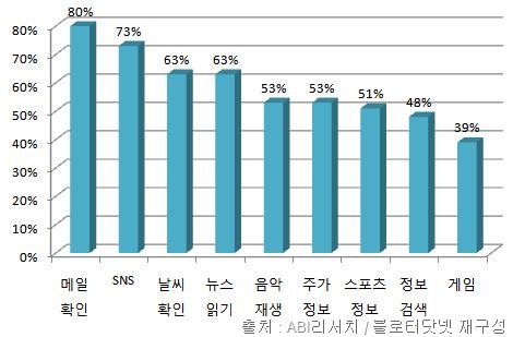 ÀÌ¿ëÀÚµéÀº À̸ÞÀÏ È®ÀÎ(80%)°ú ¼Ò¼È ³×Æ®¿öÅ·(73%) À̿ܿ¡ ³¯¾¾ È®Àΰú ´º½º Àбâ(°¢°¢ 63%), À½¾Ç Àç»ý ¹× ÁÖ°¡ Á¤º¸ È®ÀÎ(°¢°¢ 53%)À» ÇÏ·ç¿¡ ÇÑ ¹ø ÀÌ»ó »ç¿ëÇÏ´Â °ÍÀ¸·Î µå·¯³µ´Ù. ´ÙÀ½À¸·Î ½ºÆ÷Ã÷ ½ºÄÚ¾î È®ÀÎ(51%)°ú Á¤º¸ °Ë»ö(48%), °ÔÀÓ(39%) ¼øÀ̾ú´Ù.