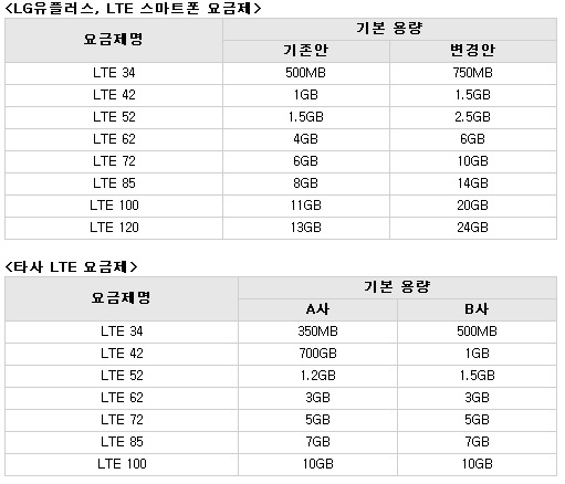 LTE34 ¿ä±ÝÁ¦´Â ±âÁ¸ 500¸Þ°¡¹ÙÀÌÆ®(MB)¿¡¼­ 750MB·Î, LTE42´Â 1GB¿¡¼­ 1.5GB, LTE52´Â 1.5GB¿¡¼­ 2.5GB·Î ¿ë·®À» ´Ã¿´´Ù.