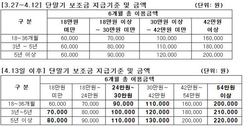 À̹ø¿¡ º¯°æµÈ KTFÀÇ º¸Á¶±Ý ÀÌ¿ë¾à°üÀ» »ìÆìº¸¸é, ´Ü¸»±â º¸Á¶±ÝÀ» 6°³¿ù ÃÑ ÀÌ¿ë±Ý¾×ÀÌ 18¸¸¿ø ¹Ì¸¸ÀÎ °æ¿ì 3³âÀÌ»ó °¡ÀÔÀÚ¿¡°Ô 1~2¸¸¿ø, 24~30¸¸¿øÀÎ Àü °í°´¿¡°Ô 2¸¸¿ø, 30~42¸¸¿øÀÎ Àü °í°´¿¡°Ô 1¸¸¿ø, 54¸¸¿ø ÀÌ»óÀÎ °í°´¿¡°Ô 2~4¸¸¿øÀÇ Ãß°¡ º¸Á¶±ÝÀÌ Á¦°øµÈ´Ù.