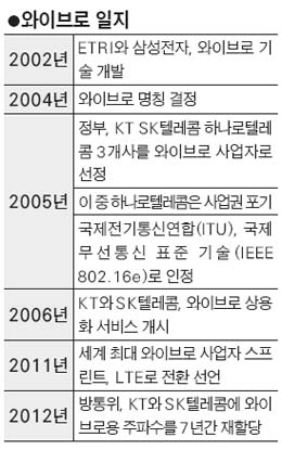 ¿ÍÀ̺ê·Î°¡ óÀ½ ³ª¿Ô´ø 2002³â¸¸Çصµ À̵¿Çϸ鼭 °í¼ÓÀ¸·Î µ¥ÀÌÅ͸¦ ÁÖ°í ¹ÞÀ» ¼ö ÀÖ´Â ±â¼úÀº ¼ÓµµÃø¸é¿¡¼­ ¿ÍÀ̺ê·Î°¡ ´Ü¿¬ ¿ìÀ§¿´´Ù. ´ç½Ã±îÁö LTE´Â Á¦´ë·Î ±â¼ú°³¹ßÀÌ ÀÌ·ïÁöÁö ¾ÊÀº »óÅ¿´´Ù. Á¤ºÎµµ ±¹Ã¥»ç¾÷À¸·Î ¿ÍÀ̺ê·Î¸¦ ¹Ð¾ú´Ù.