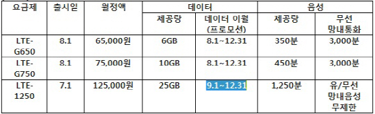 »õ·Î ³»³õÀº LTE ¿ä±ÝÁ¦ ¶ÇÇÑ ÆÄ°ÝÀûÀÌ´Ù. 9¿ù1ÀϺÎÅÍ Ãâ½ÃÇÏ´Â `LTE-1250`¿ä±ÝÁ¦´Â ¿ù 12¸¸5000¿øÀ» ³»¸é 25GBÀÇ µ¥ÀÌÅÍ¿Í 1250ºÐÀÇ À½¼ºÅëÈ, KT¸Á³» ¹«Á¦ÇÑ À½¼ºÅëȸ¦ Á¦°øÇÑ´Ù. µ¥ÀÌÅÍ´Â °íÇØ»óµµ ¿µÈ 20¿©ÆíÀ» º¼ ¼ö ÀÖ´Â ºÐ·®ÀÌ´Ù. ¶ÇÇÑ 8¿ù¿¡´Â ¸Á³»ÅëÈ 3000ºÐÀ» Á¦°øÇÏ´Â »õ·Î¿î ¿ä±ÝÁ¦¸¦ Ãß°¡·Î ³»³õÀ» ¿¹Á¤ÀÌ´Ù.