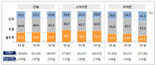 £§2012³â »ó¹Ý±â À̵¿Åë½Å ±âȹÁ¶»ç£§ ÀÚ·á¿¡ µû¸£¸é 12³â »ó¹Ý±â À̵¿ÀüÈ­ ÀÌ¿ë¿ä±Ý¿¡ ´ëÇÑ ¼ÒºñÀÚ ¸¸Á·µµ´Â 2.87Á¡À¸·Î Àü³â µ¿±â ´ëºñ(2.9Á¡) ´Ù¼Ò Ç϶ôÇÑ °ÍÀ¸·Î Á¶»çµÆ´Ù.