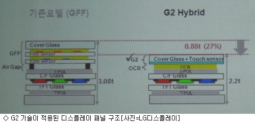LGµð½ºÇ÷¹ÀÌ ±èº´±¸ »ó¹«( IT¸ð¹ÙÀÏ»ç¾÷ºÎ °³¹ßºÎÀå)´Â £¢ÇöÀç±îÁö ³ª¿ÍÀÖ´Â ÀϹÝÀûÀÎ ½º¸¶Æ®ÆùÀÇ ±¸¼ºÀÌ ±âÁ¸ TFT LCD ¸ðµâ À§ÂÊ¿¡ ÅÍÄ¡¼¾¼­ Çʸ§°ú ±Û¶ó½º ¹Ù±ù¿¡ Ä¿¹ö±Û¶ó½º¸¦ ºÙÀÌ´Â ±¸¼ºÀ̾ú´Ù¸é £§G£§Æù¿¡¼± ÅÍÄ¡Çʸ§ÀÌ »ç¶óÁö°í ÅÍÄ¡Àü±ØÀÌ Ä¿¹ö±Û¶ó½º¿¡ ÀÏüȭµÆ´Ù£¢¸ç £¢À̸¦ G2¶ó°í ºÎ¸£´Âµ¥ ±Û¶ó½º ³» µÎ °³ÀÇ ¼¾¼­Àü±ØÀ» ÀÏüȭ½ÃÄ×´Ù£¢°í ¼³¸íÇß´Ù.