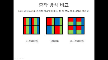 ÇÏÁö¸¸ ½ÇÁ¦·Î´Â ÇØ»óµµ¸¦ ÈξÀ ²ø¾î¿Ã¸° °ÍÀ¸·Î Æò°¡¹Þ°í ÀÖ´Ù. °¶·°½Ã³ëÆ®³ª °¶·°½ÃS3¸¦ Æ÷ÇÔÇØ ±âÁ¸ ½º¸¶Æ®Æù µð½ºÇ÷¹ÀÌ¿¡ Àû¿ëÇÑ ÁõÂø ¹æ½ÄÀÌ `ÆæÅ¸ÀÏ`À̾ú±â ¶§¹®ÀÌ´Ù. ÆæÅ¸ÀÏ ¹æ½ÄÀº ÇÑ Çȼ¿(È­¼Ò)¿¡ Àû(R)¡¤³ì(G)À̳ª û(B)¡¤³ì(G)¸¸À» ³ÖÀº ÁõÂø ¹æ½ÄÀ» ¸»ÇÑ´Ù. »ö±òÀ» Á¤È®ÇÏ°Ô ±¸ÇöÇϱâ À§Çؼ­´Â È­¼Ò Çϳª¿¡ RGB À¯±â¹°ÀÌ ¸ðµÎ µé¾î°¡¾ß ÇÏÁö¸¸, È­¼Ò Å©±â°¡ ÀÛ¾ÆÁú¼ö·Ï ÁõÂøÀÌ ¾î·Æ´Ù. R°ú BÀÇ Å©±â¸¦ Ű¿ì°í ¹ø°¥¾Æ ¹èÄ¡ÇÑ ÆæÅ¸ÀÏ ¹æ½ÄÀÌ È°¿ëµÈ ÀÌÀ¯´Ù.