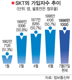 SKT´Â Áö³´Þ ¸»±îÁö ¡®°¡ÀÔÀÚ 2000¸¸¸í¡¯¿¡ ºÒ°ú 1¸¸6000¸íÀ» ³²°Ü µ×°í, ¸Å´Þ Æò±Õ °¡ÀÔÀÚ°¡ 6¸¸¡7¸¸¸í¾¿ ´Ã¾î ÀÌ´Þ Áß¼øÂë ¡®´ë¸ÁÀÇ 2000¸¸¸í µ¹ÆÄ¡¯´Â ¹«³ÇÒ °ÍÀ¸·Î ¿¹»óµÆ´Ù. SKT °ü°èÀÚ´Â ¡°6¿ù ¹«¸®ÇÏ°Ô °¡ÀÔÀÚ¸¦ È®º¸ÇÏ´Â ¹Ù¶÷¿¡ Åë½ÅÀ§¿øÈ¸ Á¶»ç°¡ ¿ì·ÁµÅ ÀÌó·³ Á÷±ÇÇØÁö°¡ ´Ã°Ô µÆ´Ù¡±¸ç ¡°´ÙÀ½´Þ ÃÊ¿¡³ª 2000¸¸¸í µ¹ÆÄ°¡ ¿¹»óµÇ¸ç, ÀÌ¿¡ µû¸¥ °£´ÜÇÑ ÃàÇÏ Çà»ç°¡ ÀÖÀ» °Í¡±À̶ó°í ¸»Çß´Ù. ÇÑÆí ÀÌÅë 3»ç´Â 1ÀÏ¿¡ 7¿ù °¡ÀÔÀÚ ÇöȲÀ» °¢°¢ ¹ßÇ¥ÇÑ´Ù.