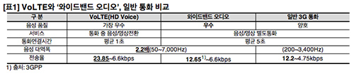 µÎ ±â¼úÀº ´à±âµµ, ´àÁö ¾Ê±âµµ Çß´Ù. °øÅëÁ¡Àº AMR-WB ¿Àµð¿À ÄÚµ¦À» ¾´´Ù´Â Á¡ÀÌ´Ù. ÀÛÀº ¿ë·®¿¡µµ ÃÖ´ëÇÑ ÁÁÀº ¼Ò¸®¸¦ ³»±â À§ÇÑ ¾ÐÃà ¹æ½ÄÀÌ´Ù. ±×·¡¼ ¼Ò¸®¸¦ ´ãÀ» ¼ö ÀÖ´Â Á֯ļö ´ë¿ªÆøÀº VoLTE¿Í ¶È°°ÀÌ 50~7000Hz´Ù. ÀÏ¹Ý 3GÅëȰ¡ 200~3400Hz Á¤µµ¸¦ ´ã±â ¶§¹®¿¡ Åë½Å»çµéÀº 2.2¹è ±ú²ýÇÑ ¼Ò¸®¸¦ µé·ÁÁØ´Ù°í ¸»ÇÑ´Ù. ÇÏÁö¸¸ À½ÁúÀ» °áÁ¤ÇÏ´Â ¶Ç ÇϳªÀÇ ¿ä¼ÒÀÎ Àü¼Û·üÀº ÃÖ´ë 12kbps ¼öÁØÀ¸·Î 3G¿Í ¶È°°´Ù. VoLTE´Â À̺¸´Ù 2¹è Á¤µµ ³ôÀº 23.85kbps±îÁö ³½´Ù. ¾ÆÀÌÆù5¿¡ µé¾î°¡´Â ¿ÍÀ̵å¹êµå ¿Àµð¿À´Â Á֯ļö ´ë¿ªÆøÀº VoLTE±Þ, µ¥ÀÌÅÍ Àü¼Û·üÀº 3G ÅëȱÞÀ¸·Î ÀÌ·ïÁö´Â ¼ÀÀÌ´Ù.