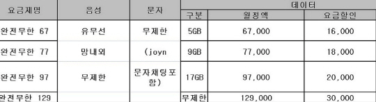 ¡®À¯¼±¹«¼± ¿ÏÀü¹«ÇÑ ¿ä±ÝÁ¦¡¯´Â 67, 77, 97, 129 µî ÃÑ 4Á¾À¸·Î ±¸¼ºµÅ ÀÖÀ¸¸ç, ¸ðµÎ ¸Á³»¿Ü ±¸ºÐ ¾øÀÌ À¯¼±°ú ¹«¼± ÅëÈ­°¡ ¹«Á¦ÇÑÀÌ´Ù. ¿µ»óÅëÈ­´Â º°µµ Á¦°øµÇ´Â 50ºÐ³»¿¡¼­ ¹«·á ÀÌ¿ë °¡´ÉÇϸç, SMS/MMS ¹× joyn ¹®ÀÚäÆÃÀ» Æ÷ÇÔÇÑ ¸ðµç ¹®ÀÚµµ ¸Á³»¿Ü ±¸ºÐ ¾øÀÌ ¿ÏÀü ¹«Á¦ÇÑ Á¦°øÇÑ´Ù.