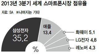 »ï¼ºÀüÀÚ´Â 1ºÐ±â¿¡ 6940¸¸´ë, 2ºÐ±â¿¡ 7600¸¸´ë¸¦ ÆÇ¸ÅÇÑ µ¥ À̾î 3ºÐ±â¿¡µµ ÀÚ½ÅÀÇ ºÐ±â ÆÇ¸Å·® ±â·ÏÀ» °æ½ÅÇß´Ù. ´ë¼ö ±âÁØ ½ÃÀåÁ¡À¯À²µµ 35.2%·Î »ç»ó ÃÖ°íÄ¡¸¦ ±â·ÏÇß´Ù. ¾ÖÇÃÀº ½ÃÀåÁ¡À¯À²ÀÌ 2ºÐ±â 13.6%¿¡¼­ 13.4%·Î ¿ÀÈ÷·Á ¼ÒÆø ¶³¾îÁ® Ç϶ô¼¼¸¦ À̾´Ù. ´Ù¸¸, 3ºÐ±â ¸» ÆÇ¸Å¸¦ ½ÃÀÛÇÑ ¾ÆÀÌÆù5s¿Í 5cÀÇ ¹ÝÀÀÀÌ ÁÁ¾Æ, 4ºÐ±â¿¡´Â Á¡À¯À²ÀÌ ´Ù½Ã ¿Ã¶ó°¥ °¡´É¼ºÀÌ Ä¿ º¸ÀδÙ.