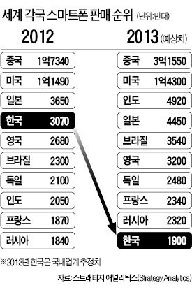 ¹Ì±¹ ½ÃÀåÁ¶»ç¾÷ü ½ºÆ®·¡Æ¼Áö¾Ö³Î¸®Æ½½º(SA)¿¡ µû¸£¸é Áö³­ÇØ Çѱ¹ ½º¸¶Æ®Æù ÆÇ¸Å·®Àº 3070¸¸´ë¿´´Ù. Áß±¹ ¹Ì±¹ ÀϺ»¿¡ ÀÌ¾î ¼¼°è 4À§ ±Ô¸ð´Ù. SA´Â ¿ÃÇØ Çѱ¹ ÆÇ¸Å·®Àº 2630¸¸´ë·Î ÁÙ¾î 7À§·Î ¶³¾îÁú °ÍÀ¸·Î Áö³­ 9¿ù ³»´ÙºÃ´Ù.