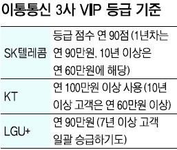 SKT´Â °¡ÀԱⰣ¿¡ µû¶ó °í°´ µî±Þ Á¡¼ö¿¡ °¡Á¡À» ÁØ´Ù. ¶§¹®¿¡ °¡ÀԱⰣ 10³âÀÌ ³ÑÀ¸¸é µî±Þ Á¡¼ö¿¡ 1.5¹è °¡ÁßÄ¡¸¦ ¹Þ¾Æ VIP ±âÁØÀÌ ¿¬ 60¸¸¿øÀ¸·Î ¶³¾îÁø´Ù. KTµµ 10³â ÀÌ»ó ¸ð¹ÙÀÏ¡¤ÀÎÅÍ³Ý °¡ÀÔÀÚ¿¡°Ô´Â ¡®ÇÑ µî±Þ Çâ»ó¡¯ÀÇ Æ¯ÀüÀ» ºÎ¿©ÇØ ¿¬ 60¸¸¿ø¸¸ ¾²¸é VIP°¡ µÉ ¼ö ÀÖ´Ù. LGU+´Â Áö³´Þ °¡ÀԱⰣ 7³â ÀÌ»ó ÀÏ¹Ý °í°´ÀÇ µî±ÞÀ» VIP·Î Àϰý ½Â±Þ½ÃÄ×´Ù.