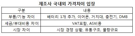 ¿ì¼± Á¦Á¶»çµéÀº ±¹³»¿Ü Á¦Ç°ÀÇ ºÎǰ°ú ±â´ÉÀÌ ´Ù¸£´Ù°í ÁÖÀåÇß´Ù. Çѱ¹Àº ¹èÅ͸® 1°³¸¦ Ãß°¡ Á¦°øÇÑ´Ù. À̾îÆù°ú °ÅÄ¡´ë, ÃæÀü±âµµ £§°øÂ¥·Î£§ ÁØ´Ù. °Ô´Ù°¡ ±¹³» ½º¸¶Æ®Æù¿¡´Â Áö»óÆÄ DMB(µðÁöÅй̵ð¾î¹æ¼Û) ±â´Éµµ Ãß°¡µÅ ÀÖ´Ù.