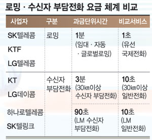 SKÅÚ·¹ÄÞ¡¤LGÅÚ·¹ÄÞÀº ÈÞ´ëÆù ·Î¹Ö ¿ä±ÝÀ» ÃÖ°í 1ºÐ ´ÜÀ§±îÁö °è»êÇÑ´Ù. ¹Ý¸é KTF ·Î¹Ö °í°´Àº ÇØ¿Ü¿¡¼ ±¹³»·Î Àüȸ¦ °É ¶§´Â ¹«Á¶°Ç 1ºÐ ´ÜÀ§ ¿ä±ÝÀ» Àû¿ë ¹Þ´Â´Ù.