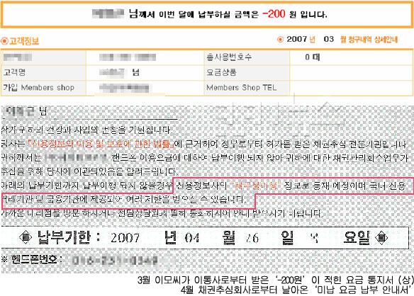 ´õ Ȳ´çÇÑ °ÍÀº 3¿ù ÀÌÅë»ç·ÎºÎÅÍ ¹ÞÀº ¡®-200¿ø¡¯ÀÌ ÀûÈù ¿ä±Ý ÅëÁö¼¿´´Ù. ¹øÈ£ À̵¿À» Çϱâ Àü 200¿øÀ» ´õ ³ÂÀ¸´Ï µ¹·Á¹ÞÀ¸¶ó´Â °ÍÀ̾ú´Ù.