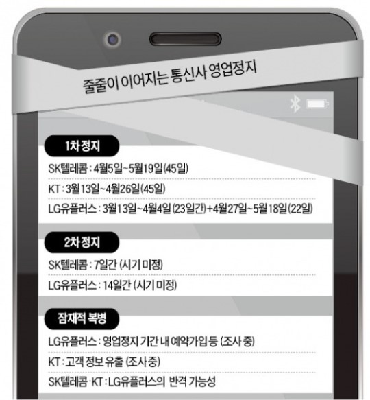 SKÅÚ·¹ÄÞ KT LGÀ¯Ç÷¯½º´Â Áö³­ 3¿ùºÎÅÍ Â÷·Ê·Î ¿µ¾÷À» ÇÏÁö ¸øÇϰí ÀÖ´Ù. ºÒ¹ý º¸Á¶±ÝÀ» »ìÆ÷Çß´Ù´Â ÀÌÀ¯¿¡¼­´Ù. KT´Â 3¿ù13ÀϺÎÅÍ 45Àϰ£ ¡®ÀÚ¼÷¡¯Çß°í, SKÅÚ·¹ÄÞÀº Áö³­ 5ÀϺÎÅÍ ´ÙÀ½´Þ 19ÀϱîÁö, LGÀ¯Ç÷¯½º´Â ´ÙÀ½´Þ 18ÀϱîÁö ¹®À» ´Ý´Â´Ù. ¹®Á¦´Â ¿©±â¼­ ³¡³ªÁö ¾Ê´Â´Ù´Â °Í. ÀÌÅë 3»ç ¸ðµÎ Ãß°¡ ¿µ¾÷Á¤Áö°¡ ÀÌ¹Ì È®Á¤µÆ°Å³ª ¹® ´ÝÀ» °³¿¬¼ºÀÌ ¿­·Á ÀÖ´Â »óÅ´Ù. ¿µ¾÷Á¤Áö ¹æ½ÄÀ̳ª ±â°£¿¡ µû¶ó °æÀï»ç °£ Èñºñµµ ¾ù°¥¸± Àü¸ÁÀÌ´Ù. º½ÀÌ ¿Ô°Ç¸¸, Åë½Å»ç¿¡ ºÒ¾î´ÚÄ£ ¿µ¾÷Á¤Áö ÇÑÆÄ´Â ¿©ÀüÈ÷ ÇöÀç ÁøÇàÇüÀÌ´Ù.
